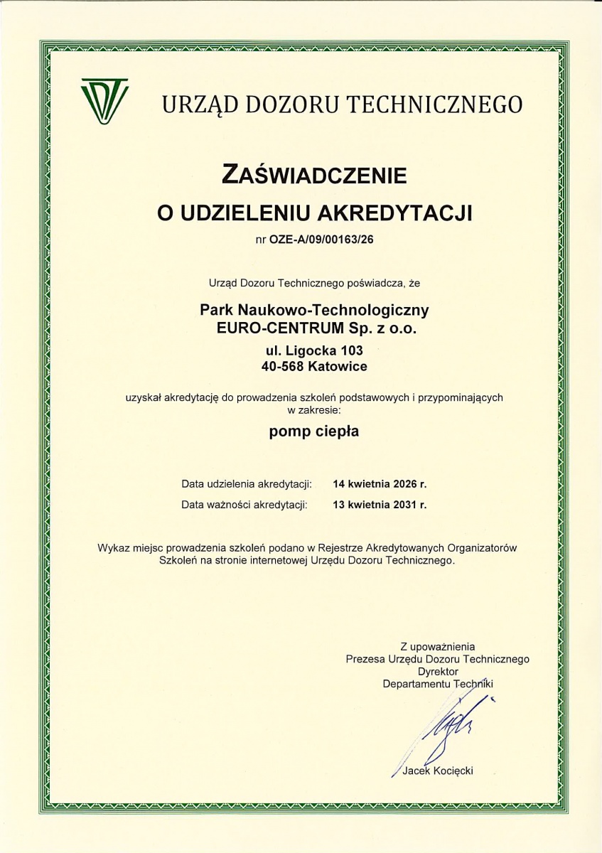 Z przyjemnością informujemy, że akredytacja naszego ośrodka szkoleniowego w zakresie szkoleń dla instalatorów pomp ciepła została oficjalnie przedłużona przez Prezesa Urząd Dozoru Technicznego.